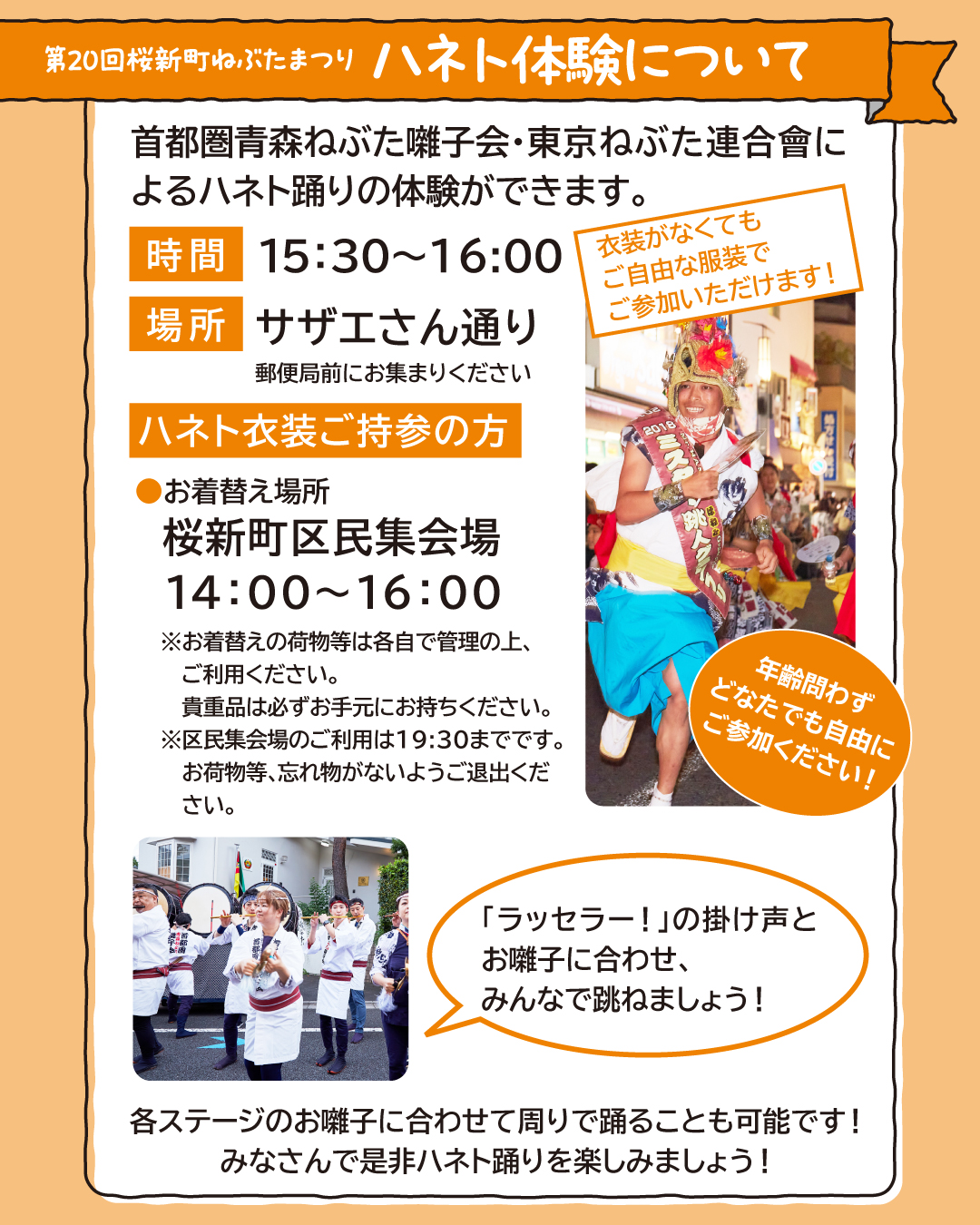 また、お祭り会場内では各種イベントが行われます。年齢問わずご参加いただける「ハネト体験」など、詳細はイベントスケジュールをご確認ください。